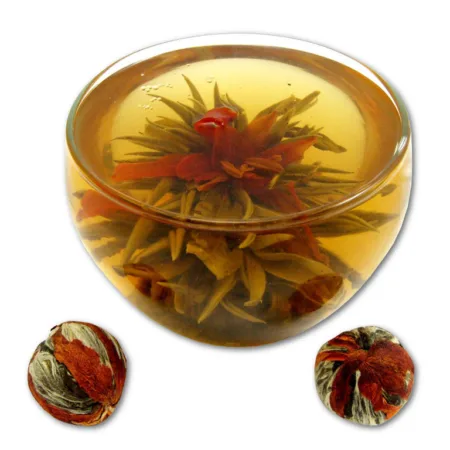 ☕ Sposób zaparzania: 1 kulka herbaty na 400–500 ml wody o temperaturze 80–85°C. Wlać wodę powoli do dzbanka lub dużej filiżanki i obserwować proces rozkwitania. Parzyć 3–5 minut. Można zalewać kilkukrotnie.