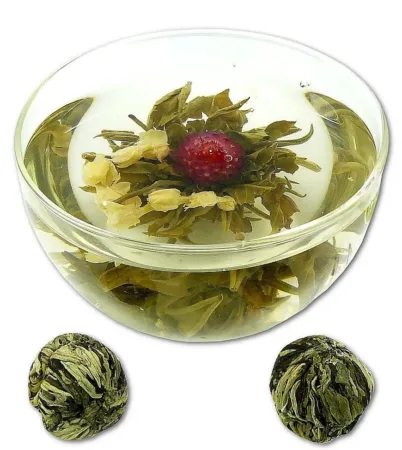 ☕ Sposób zaparzania: 1 kulka herbaty na 400–500 ml wody o temperaturze 75–80°C. Zalać wodą w szklanym naczyniu, aby obserwować proces rozkwitania. Parzyć 3–5 minut. Można parzyć 2–3 razy.